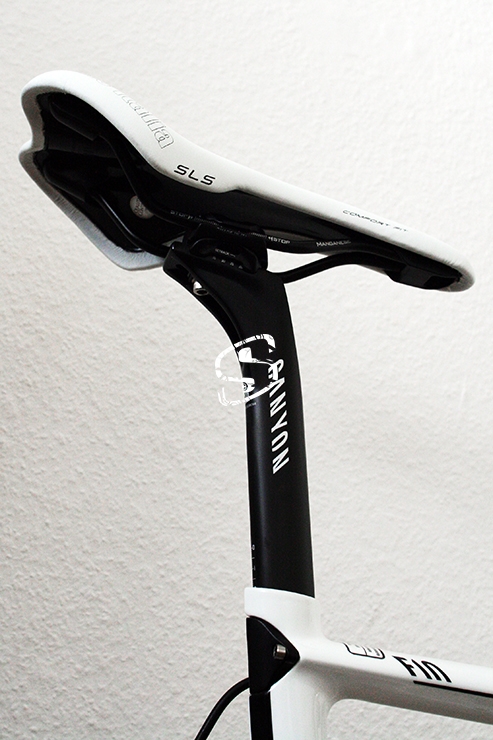 Ein optisches Schmankerl sind die innen verlegten Seilzüge sowie die integrierte Klemmung der Sattelstütze. Sie fixiert die aerodynamisch optimierte VCLS Sattelstütze mit zwei Schrauben am Oberrohr. Die Eigenentwicklung aus Karbon- und Basaltfasern mit ovaler Rohrform verleiht der Sattelstütze mehr Steifigkeit und bessere Dämpfung. Der großzügige Einstellbereich des Sattelstützenkopfes mit einem Setback von 20mm schafft eine Vielzahl verschiedener Sitzpositionen und erlaubt die Sitzposition des Fahrers weiter nach vorne zu bringen. Einziges Manko: Die Schrauben der Klemmung sollten stets sauberes und gleichmäßig eingedreht werden, um nicht die einlaminierten Gewindeösen zu beschädigen. Ein Wechsel der im Karbonrohr befindlichen Inserts ist nicht möglich.