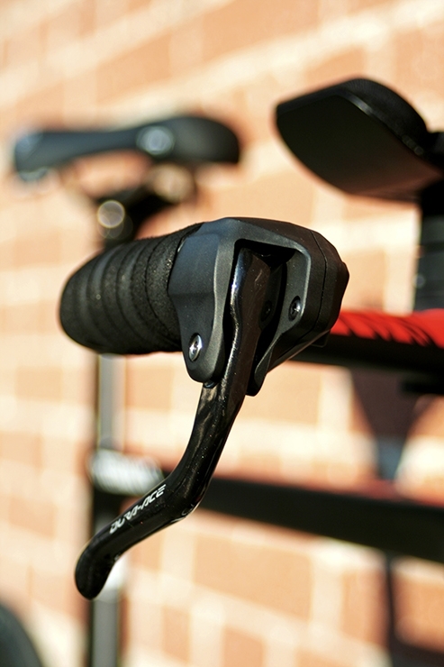 Die Schaltzüge laufen aus den hinteren Enden des Aero-Aufsatzes und verschwinden dann unmittelbar unter der Lenkerkopfabdeckung wieder, von wo aus sie im Rahmeninnern zu Schaltung und Umwerfer geführt werden. Somit sind nur 12 cm Kabel außerhalb und dem Wind ausgesetzt, welche die Aerodynamik beeinflussen könnten. Das spart erneut 4 Watt gegenüber einer Außenverlegung. Das Speedmax CF gibt es ausschließlich mit der Shimano Di2 Gruppe, mit Ultegra oder Dura Ace Komponenten, und der Batterie im Inneren des Rahmens versteckt, damit die Kabel für sämtliche elektronischen Möglichkeiten zur Verfügung stehen. Ebenso wie die gesamte Elektronik verlaufen Die Bremszüge vollständig intern.