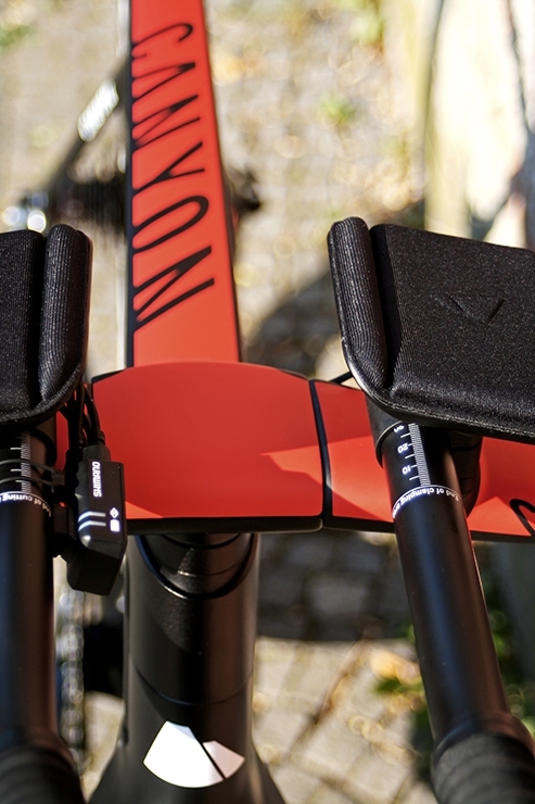 Noch mehr Optionen gibt es mit der Konfiguration des Cockpits, um es genau zu sagen 7560 verschiedene Einstellungen, wie Canyon vorrechnet. Das beginnt bereits bei der Auswahl des Basislenkers, den es einerseits waagrecht flach oder nach unten geneigt. Ebenso gibt es verschiedene Längen und Winkel des integrierten Vorbaus. Zudem kann man zwischen geraden, L- und S-förmig gebogenen Aero-Aufsätzen wählen, sowie unterschiedliche Höhen und Breiten montieren.