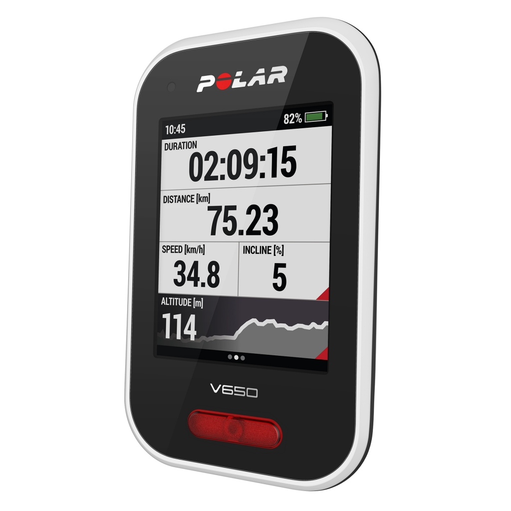 Das Display kann so eingestellt werden, dass nur Details angezeigt werden, die der Sportler während des Trainings im Blick haben möchte. Ein besonderes Highlight des Polar V650 ist das LED-Frontlicht: Bei schlechten Lichtverhältnissen schaltet es sich automatisch ein und garantiert auch in der Dämmerung eine gute Sichtbarkeit.