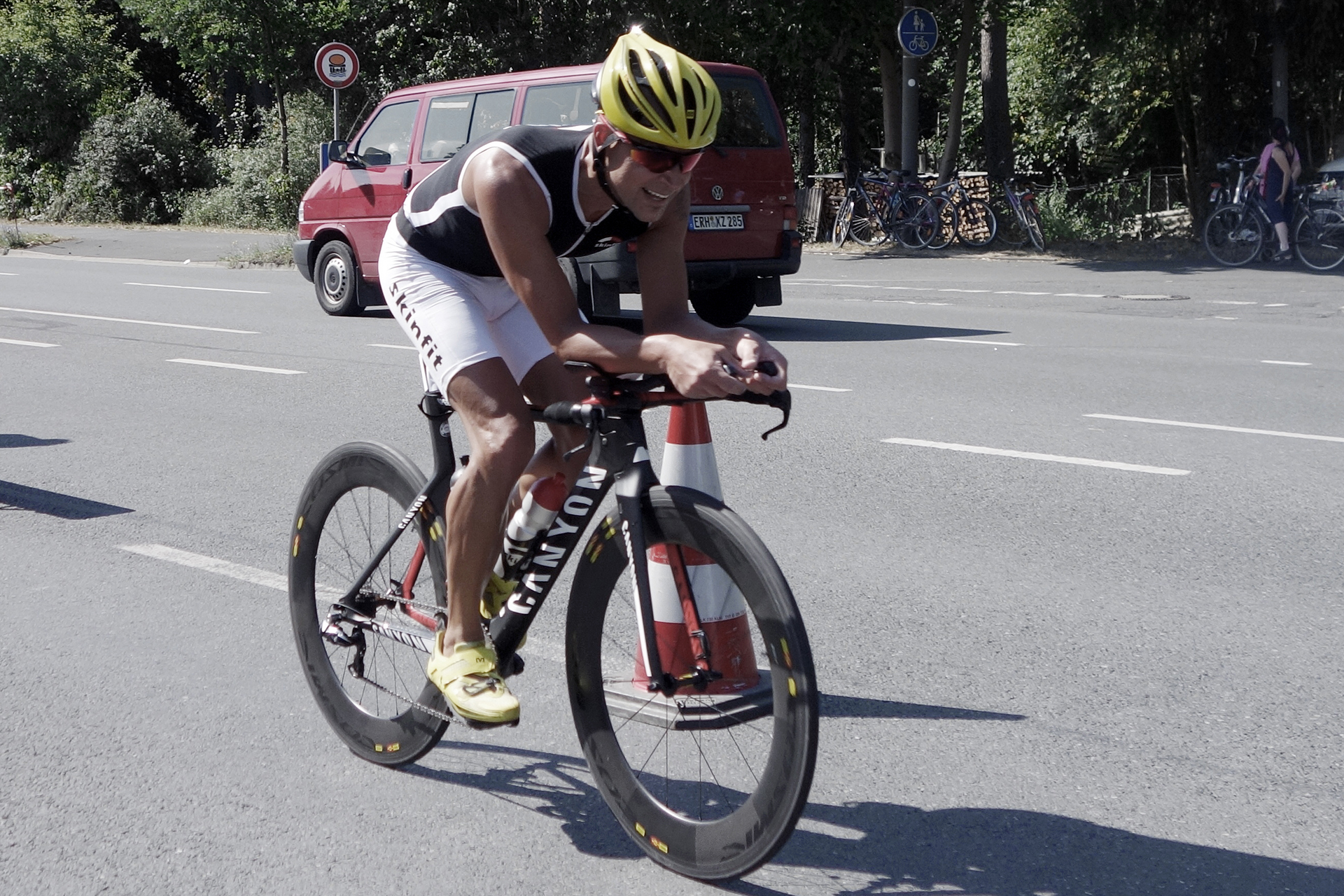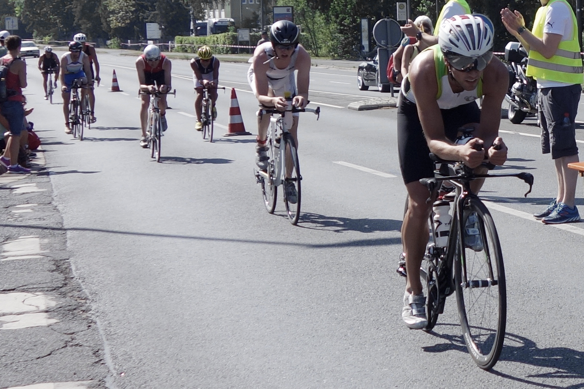 Den Neoprenanzug flink abgestreift und in den Beutel gepackt. Radhelm auf, Startnummer dran, Zeitfahrrad gepackt, durch die sehr lange Wechselzone bis zum Radaufstieg gelaufen und aufgeschwungen. Auf meiner ersten Langdistanz wird das sicher etwas weniger hektisch! Nach den ersten 1000 m auf dem Rad war alles eingerichtet und ich fuhr alleine in Begleitung des Führungsmotorrades vorne weg. Motiviert von dem guten Schwimmen habe ich von Beginn an Druck gemacht. Der Plan für den heutigen Tag war eher moderat: Der letzte Test vor meiner ersten Langdistanz war zwar ein hohes Tempo anzulegen, jedoch nicht gleich von Beginn an.