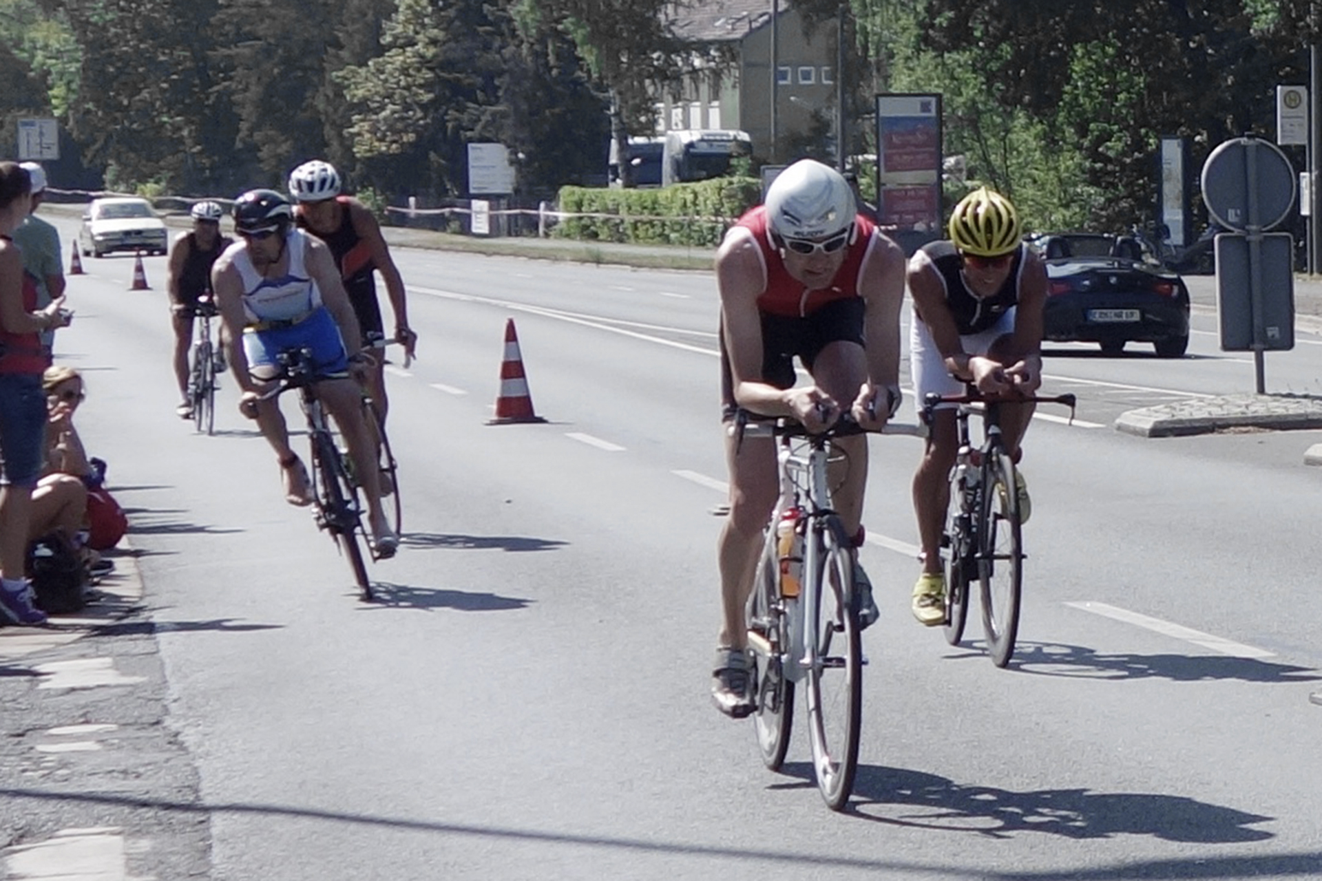 Ich ergriff also die gunst der Stunde und beschloss meinen Plan aufgrund der guten Ausgangslage zu ändern und mein Rennen fortan offensiv zu gestalten. Überraschend war nach 20 km noch kein weiterer Triathlet der Mitteldistanz in Sichtweite. Erst nach 25 km, am ersten Berg kam Bernd Hagen vorbei gerollt und hat mich als Führenden abgelöst. 5 km später hat endlich Vereinskollege Markus Stöhr (SC Prinz Eugen München) aufgeschlossen und zugleich Marco Sahm (IfA Nonstop Bamberg), sowie Matthias Türk (TDM Bamberg) als Verfolger dabei gehabt. Diese Gruppe blieb sodann bis zum Ende der ersten Radrunde zusammen und auch in Begleitung eines Kampfrichters, der ganz genau für die Einhaltung der Windschattenregeln sorgte.