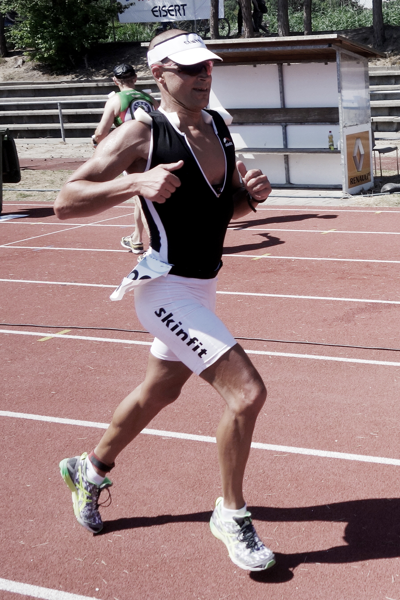 Als Dritter bin ich vom Rad abgestiegen und verlor während des Wechsels wieder einen Platz, um mir wie geplant Socken in die Laufschuhe anzuziehen – es war ja schließlich noch immer ein Testwettkampf. 10 Meter hinter Marco Sahm gings an vierter Stelle hinaus auf die Laufstrecke. Meine Beine haben sich trotz der härteren zweiten Disziplin super angefühlt und ich konnte Marco’s Tempo mitgehen. Wir erreichten zum ersten von drei Mal gemeinsam das Stadion. Ebenso geplant bin ich durch die Verpflegungsstelle gegangen, trank etwas Wasser und kühlte mich, um dann wieder zügig weiter zu laufen. Diese Strategie habe ich erstmals an selbem Ort gewählt, als ich einen ausserordetnlich schlechten Tag erwischt. Das hatte sich seitdem auch an guten Wettkampftagen mit guter Tagesform bewährt. Der Abstand zu Marco wurde durch diesen Rhythmus zwar etwas größer, aber ich wollte an der Strategie trotz aussichtsreichem Rennverlauf beibehalten – schließlich galt es noch einen Halbmarathon bei über 30 Grad zu meistern. Ein weiterer Grund war die neue Ernährungsstrategie – während des gesamten Rennens nahm ich ausschließlich Flüssigkeit mit Isomaltulose zu mir – und das Risiko auf den letzten Kilometer einzubrechen wäre sonst einfach zu groß.